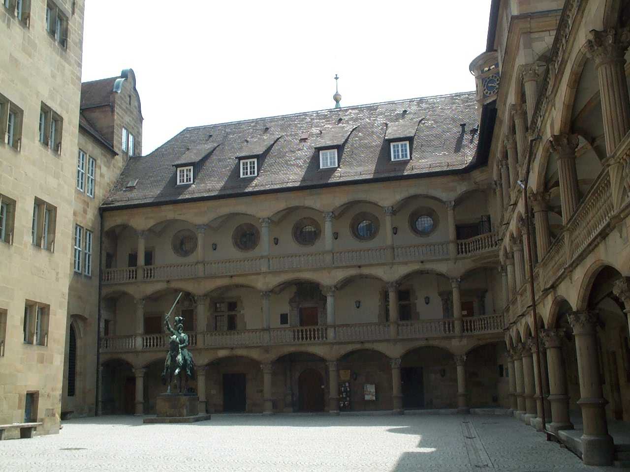 | Altes Schloß and statue of poet Friedrich Schiller. | Altes Schloß courtyard and statue of Württemberg's first duke, Eberhard. |