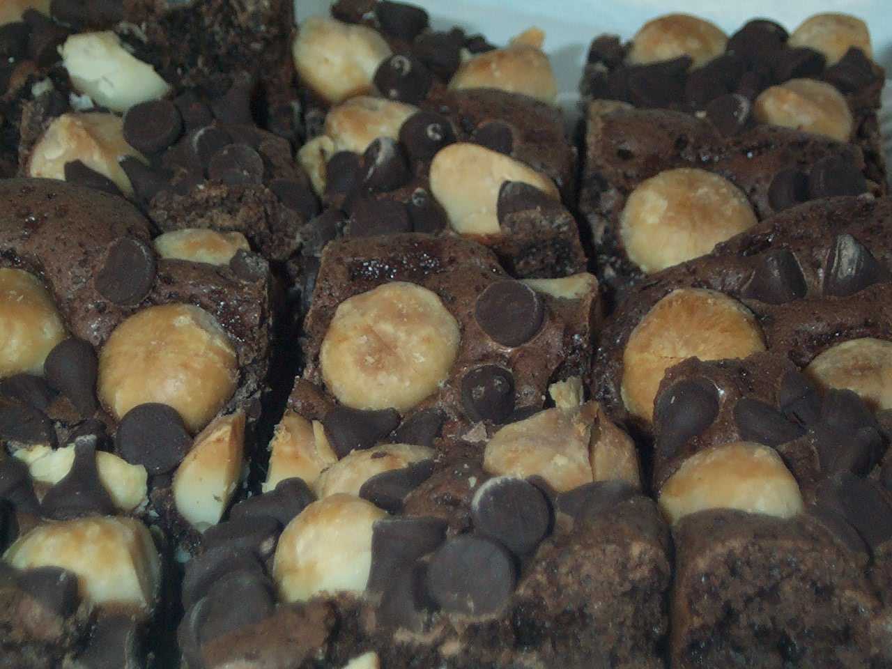 | Chocolate-Chip Macadamia Brownies ready to serve. |