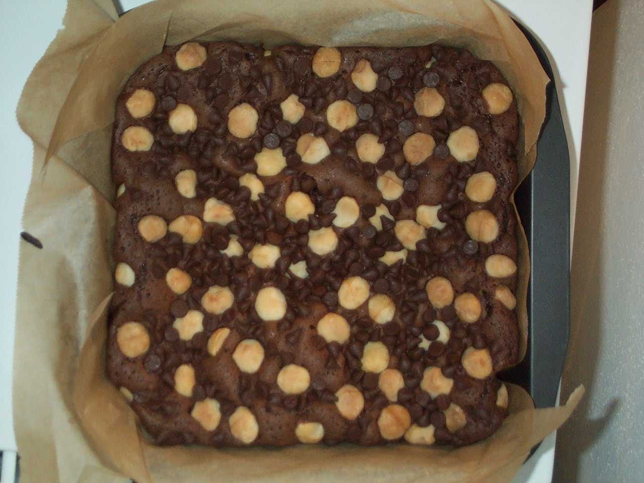 | Chocolate-Chip Macadamia Brownies fresh from the oven. |