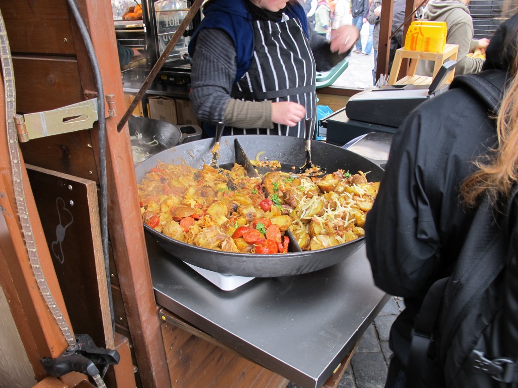Stalls were set up in a public square and were selling food. I tried a