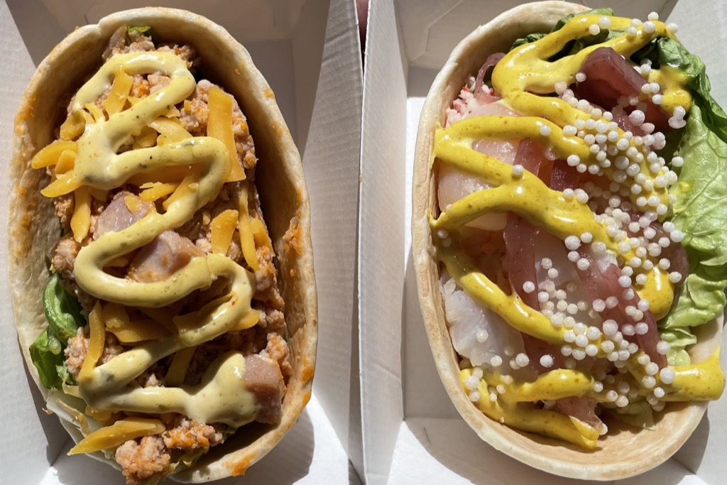these tacos, Bacon Cheese Pork on left, Shrimp Curry-Mango on right.