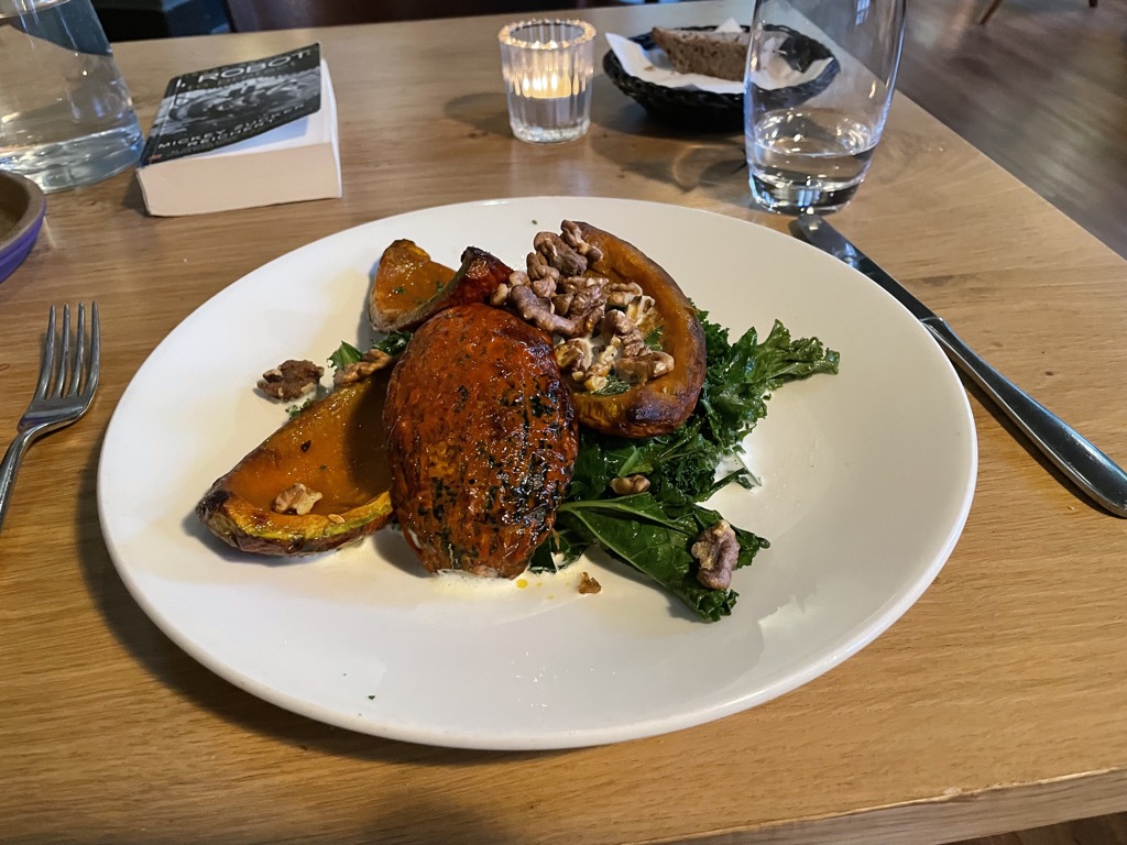 - Pumpkin, apple, and kale salad with beetroot hummus.