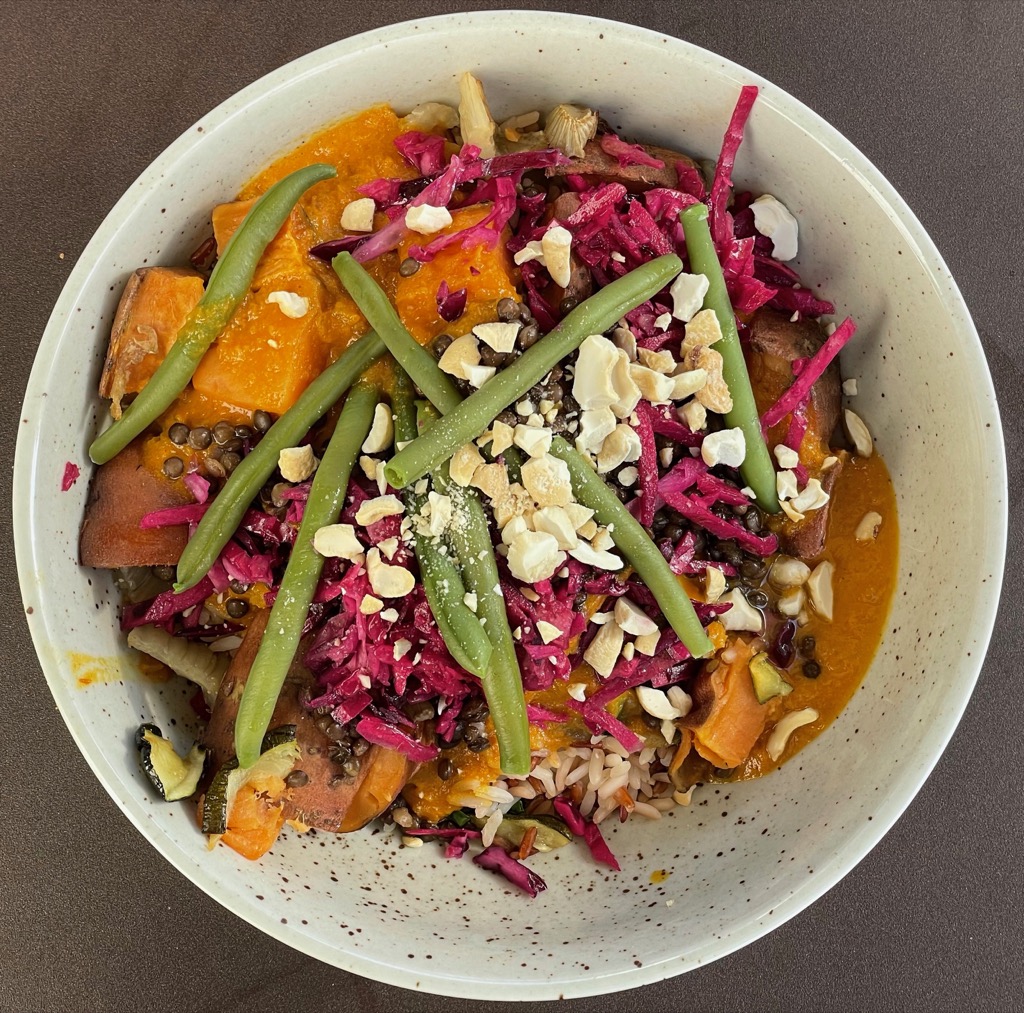 Delighted by Gandhi bowl, with a rice mix, kale, sweet potatoes, fennel,