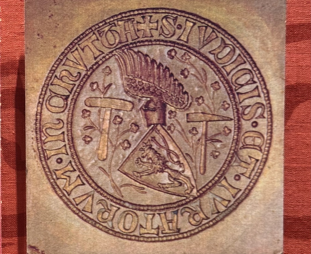 | Sign on Hrádek (little castle) with crests. That miner’s guild crest on the left matches one in the game. |