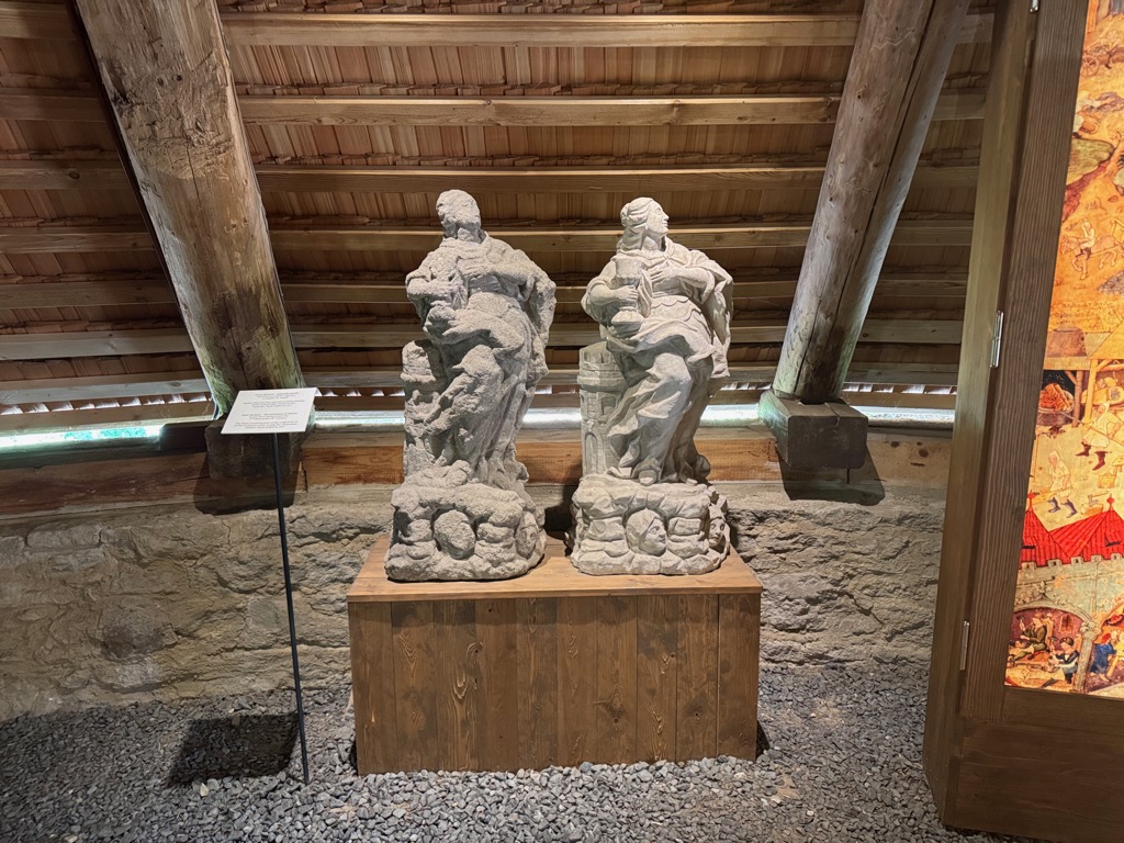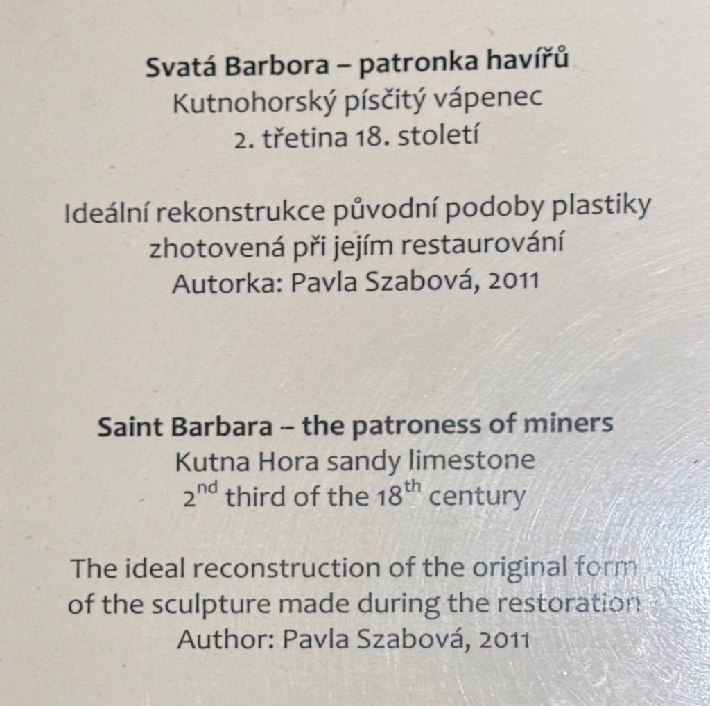 | Saint Barbara sculptures in mine museum. Original from late 1700s on the left, reconstruction from 2011 on the right. |