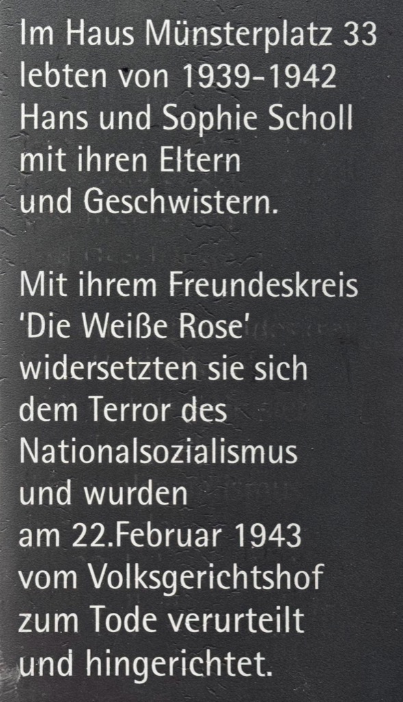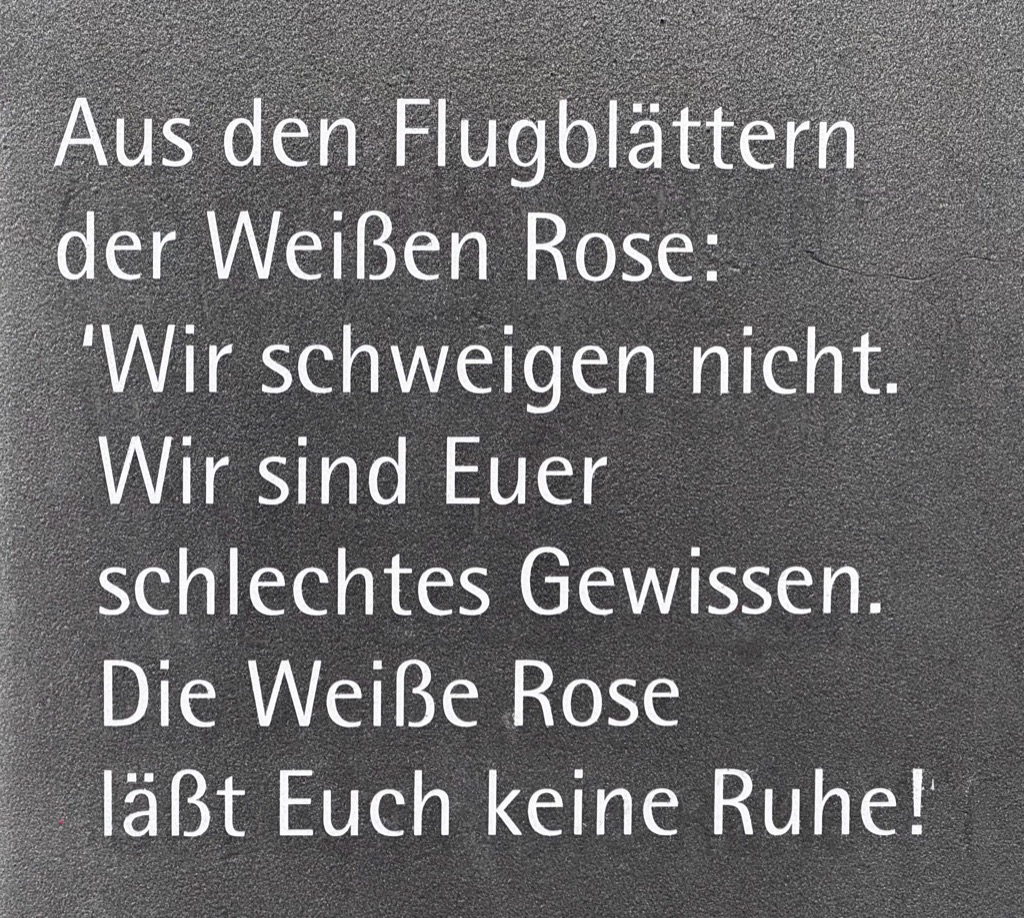 | Hans und Sophie Scholl memorial “From the White Rose leaflets: ‘We will not remain silent. We are your guilty conscience. The White Rose will not give you peace!’” |