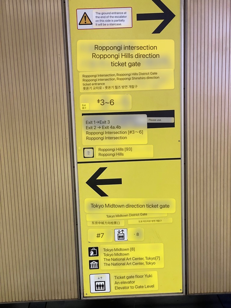 | Metro exit sign, translated. Exit information is greatly detailed, telling you which fare gate and which exit to use for various destinations. |