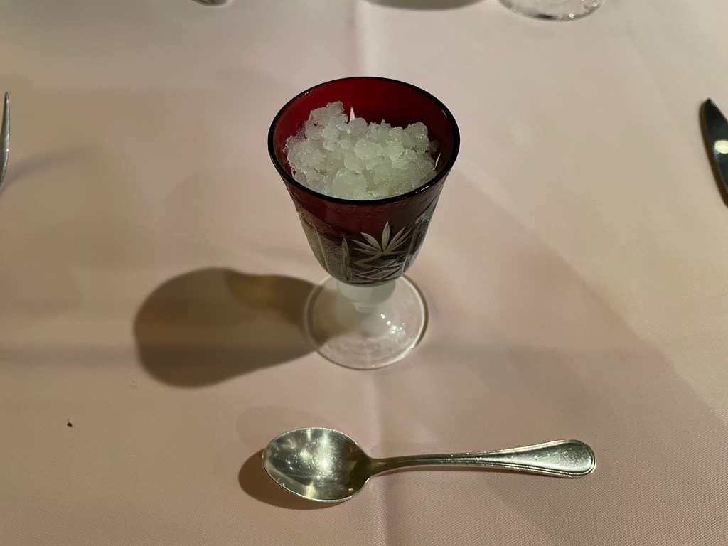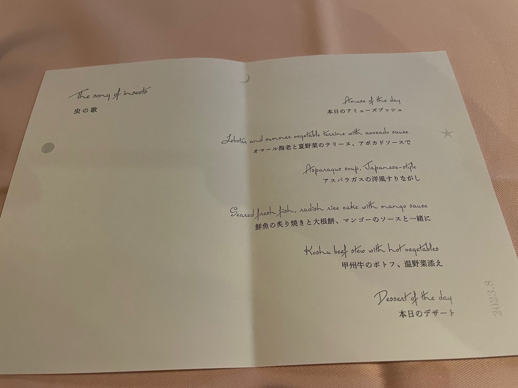| Hotel Mizno dinner. The hotel has fancy French meals. They did a good job, bringing out the flavors well. |
